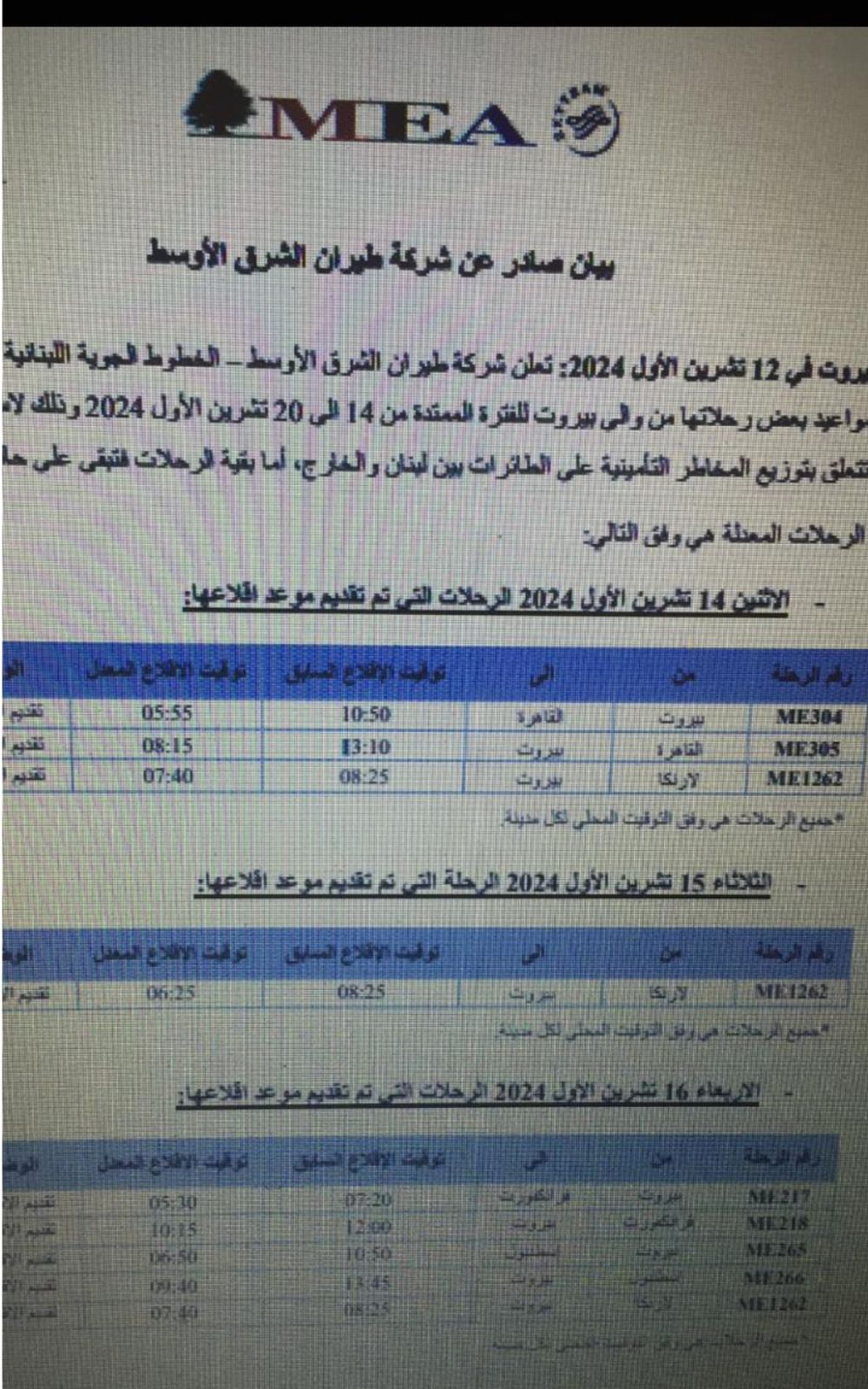 أعلنت شركة طيران الشرق الأوسط اللبنانية عن تعديل مواعيد بعض رحلاتها من والى بيروت للفترة الممتدة من 14 الى 20 تشرين الأول 2024 وذلك لاسباب تقنية تتعلق بتوزيع المخاطر التأمينية على الطائرات بين لبنان والخارج، أما بقية الرحلات فتبقى على حالها.